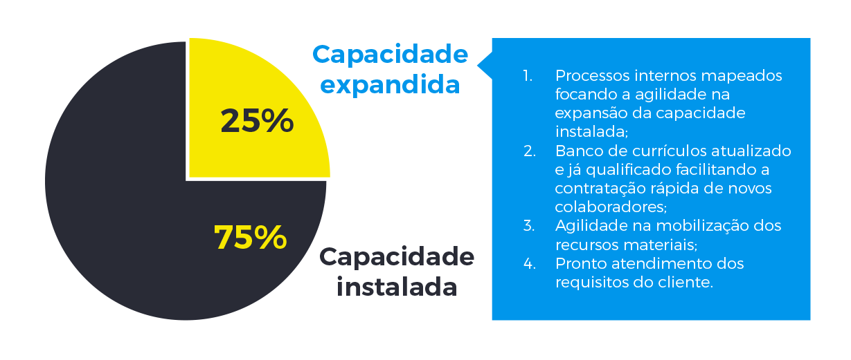 O gerenciamento da capacidade instalada é um grande diferencial da Montservice. Disponibilizamos sempre uma taxa para novos clientes e projetos. Essa taxa existe para manter o crescimento da empresa, pois, quando a capacidade está próxima ao limite, os gestores investem em recursos materiais, tecnológicos e humanos para disponibilizar uma expansão na estrutura.