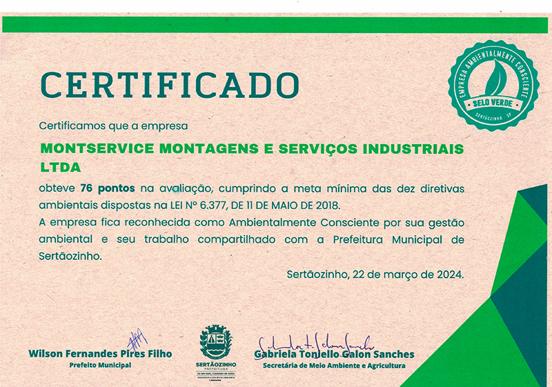 A Montservice Soluções Industriais é certificada nas normas ISO 9001:2015 pela empresa TUV NORD BRASIL e certificada na norma de saúde e segurança ISO 4500:2018, também pela TUV NORD BRASIL. O Sistema de Gestão da Qualidade é praticado na Montservice de forma sistêmica e consistente, buscando sempre a melhoria contínua dos processos para assegurar a identificação e o controle dos perigos/riscos ocupacionais decorrentes de suas atividades, produtos e serviços.